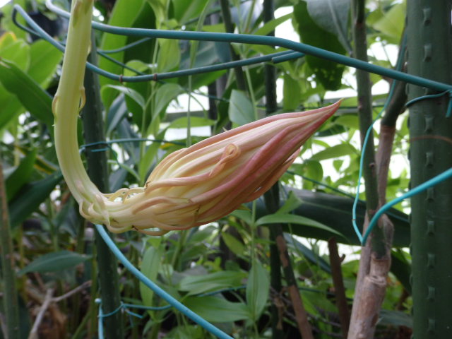 2025年09月01日 ゲッカビジン(つぼみ) 東園 温室内もうすぐ咲きそうです。夜8時頃開花して翌朝にはしぼんでしまいます。開花の様子は緑化センター公式Instagramでご覧いただけます。(Instagramはこちら)