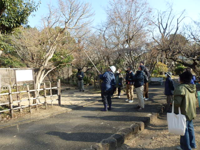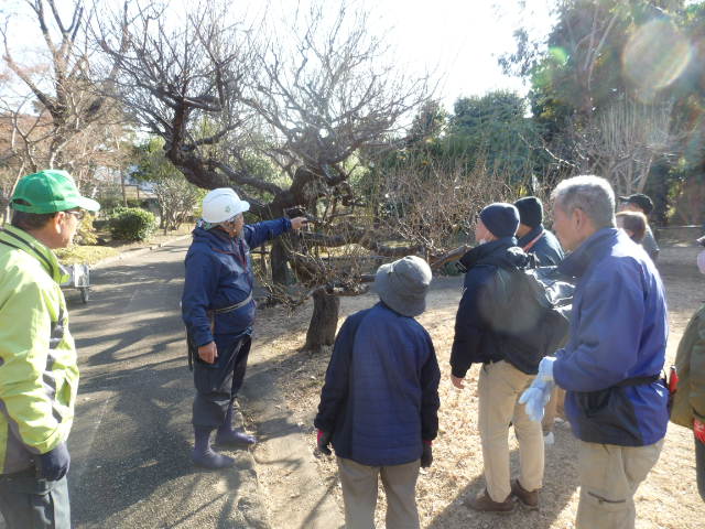 園内に植栽されているウメ、モミジ、カキの剪定方法を受講者の方と学びました。