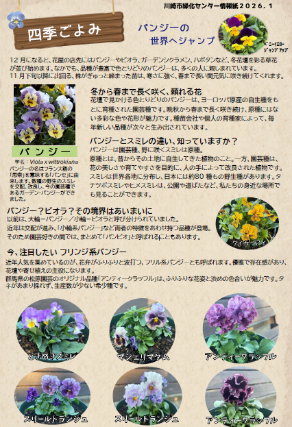 2026年01月16日 緑化センター情報誌 四季ごよみ 緑化センターで季節ごとに発行している「四季ごよみ」を発行しました。今回のテーマは「パンジー」についてです。記事をクリックするとPDFファイルが開きます。